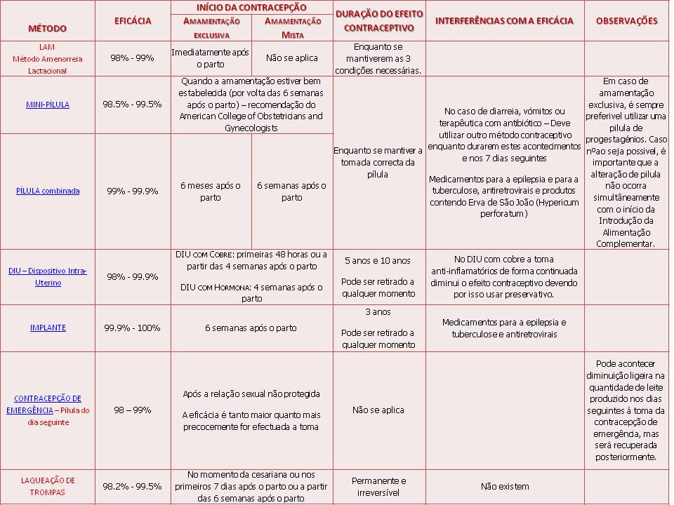 Hoje em dia, existem muitos métodos contraceptivos disponíveis para todas a mães: as que amamentam ou não, as que tem algum problema médico, etc. A eficácia de qualquer método contraceptivo depende da utilização correcta, regular e continuada. Assim pretende-se abordar os diferentes meios contraceptivos existentes e que podem ser utilizados pela mãe que está a amamentar.